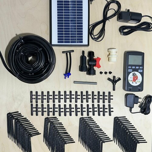 Автоматическая система для одновременного капельного полива на 60 растений. Система позволяет поливать одну, две или три грядки. Подходит как для теплиц, так и для огорода. Характеристики: управление системой- ручное, полуавтоматическое, автоматическое источник воды- любая ёмкость достаточного объёма источник питания-солнечная батарея количество растений для полива- до 60 защита от детей: чтобы случайно не сбили настройки контроллера, кнопки управления можно заблокировать. Контроллер с насосом питаются от аккумулятора на солнечной батарее. Подача воды происходит при помощи насоса, погружённого в ёмкость с водой (бочку). Набор включает в себя контроллер с дисплеем, через который осуществляется управление и настройка.