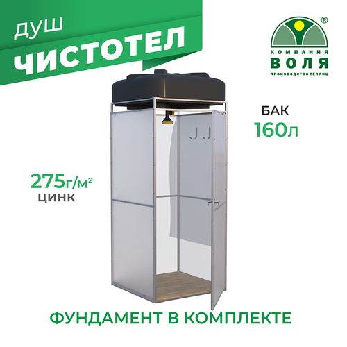 Садовый душ «Чистотел» — это идеально решение для дачного отдыха. В просторной кабинке (ширина и длина 0,93м, высота 2,11м) достаточно места, чтобы с комфортом принять душ после жаркого дня на даче. Покрытие – непрозрачный сотовый поликарбонат. Преимущества:. Поставляется в компактной упаковке, которую удобно перевозить даже на легковом автомобиле;. Конструкция легко собирается. Специальные грунтозацепы на каждую опору. Фундаментные стойки;. Каркас;. Каркас душа не нужно разбирать на зиму, а покрытие демонтировать. Двухсторонняя ручка;. Душ запирается снаружи и изнутри. Комплектация. Бак на 160 литров идеально подходит для всей семьи;. Каркас с защитным слоем цинка (275 г /м2 ) обеспечит вам срок службы до 15 лет и предотвратит появление коррозии;. Фундамент в комплекте. Крючки для одежды;. Крепеж и фурнитура;. Полиэтиленовая пленка для защиты одежды от брызг;. Сотовый поликарбонат;. Лейка для душа;. Деревянный поддон.
