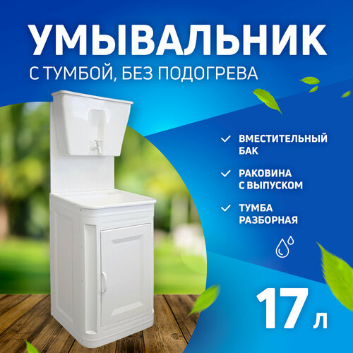 Комплект дачный Чистюля, с УМ-17 без нагрева В условиях недоступности электроэнергии позволяет в комфортных условиях мыть посуду, руки и тд. Габариты: 1. Идеально вписывается в дачный интерьер. Основные характеристики: Тип - умывальник для дачи; Монтаж - напольный; Конструкция умывальника - с тумбой, с раковиной; Материал - пластик. Раковина с выпуском из полипропилена (410х495х140 мм). Бачок для воды; 3. Тумба разборная (пластиковая) (габариты тумбы (ВхШхД) 81х42х49 см; 2. Толщина пластика - 2-2,5мм.