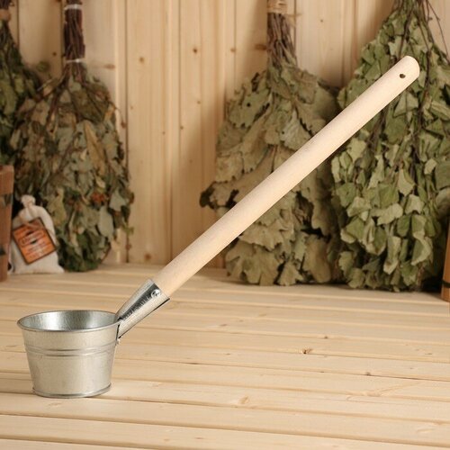Ковш для бани парной, 0,5 л. Банный Ковш - неотъемлемый аксессуар настоящей бани. Ковш для бани с деревянной ручкой позволит перелить воду быстро и просто, а длинная ручка ковша позволит это сделать безопасно. Ручка выполнена из дерева, которая не нагревается при высоких температурах. Ковш выполнен из оцинкованной стали, устойчивой к повышенным температурам, коррозии и повреждениям. Изделие имеет эргономичную форму. Данное изделие используется для обработки камней в парной различными травяными составами.