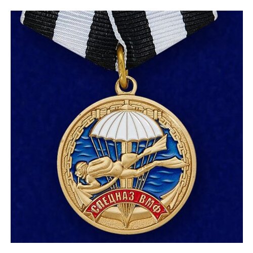 Медаль «Спецназа ВМФ» в форме 32-милиметровой окружности из латуни золотистого колера с покрытием из синей и красной эмали, пятиугольная колодка, зажим булавочного типа.