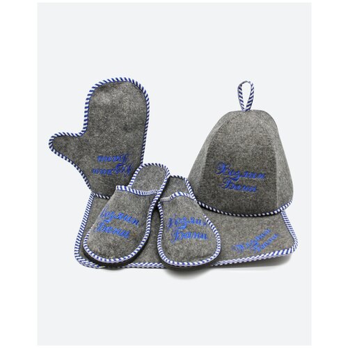 Купить Набор с вышивкой "Хозяин Бани" для бани и сауны из 4-х предметов: шапка, коврик, варежка, тапки; российский войлок за 1543 руб