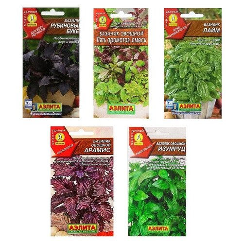 характеристики Набор семян зелени "Разноцветный базилик", 5 шт. (Рубиновый букет 1шт, Пять ароматов 1шт, Лайм 1шт, Изумруд 1шт, Арамис 1шт.)