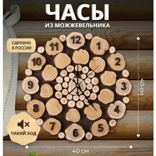 Настенные часы из спилов можжевельника – это прекрасный выбор для тех, кто ценит уникальность и красоту в деталях своего дома. Оригинальный дизайн с открытым циферблатом позволяет сполна насладиться красотой природного материала, из которого изготовлены наши часы для дачи – спилы можжевельника. Созданные с любовью и вниманием к каждой детали, деревянные часы обладают не только эстетическим привлекательным дизайном, но и приятным ароматом, который наполнит ваше помещение теплотой и уютом. Эти часы также идеальны в качестве подарка на любой праздник. Команда мастеров Люблю баню готова поделиться своими знаниями и опытом с вами. Они станут особенным дополнением к интерьеру, придавая ему особую ноту изысканности и неповторимости. Закажите прямо сейчас деревянные часы для бани и насладитесь идеальной гармонией красоты и полезности. Не упустите возможность сделать свою баню уникальной и запоминающейся. Эти часы представляют собой не только функциональный предмет, но и произведение искусства, которое придает особую ауру и стиль вашему интерьеру. Благодаря своей универсальности, часы из можжевельника могут стать как главным акцентом в оформлении комнаты, так и просто удачным дополнением к уже существующему интерьеру. Мы прекрасно понимаем важность создания здоровой и полезной обстановки в вашем доме, поэтому при изготовлении наших часов мы используем только натуральные материалы и стараемся сохранить их полезные свойства. Настенные часы прекрасно подойдут для декора дома и оформления других различных помещений – вашей бани, сауны, дачи или просто квартиры. Пусть они станут неотъемлемой частью вашего дома, наполняя его атмосферой натуральности и элегантности. Они являются уникальным и необычным презентом, который подарит радость и восхищение вашим близким. Даря настенные часы из можжевельника, вы дарите не только красивую вещь, но и частичку природы, которая создаст атмосферу гармонии и спокойствия.