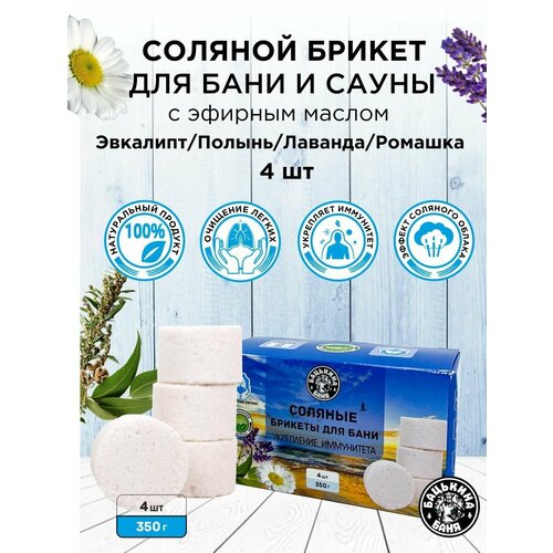 Натуральная соль для бани с эфирными маслами Эвкалипт, Полынь, Лаванда, Ромашка. Количество брикетов для бани в упаковке: 4 шт. Общий вес соли для бани 350 гр. 1 соляной брикет для бани рассчитан на объем парной: 4-6 м2. Ионы морской соли проникают в кровеносную систему и ускоряют доставку питательных веществ и кислорода в организме, что приводит к укреплению иммунитета, способствуют очищению дыхательных путей, стимулируют потоотделение, позволяя ускорить процесс вывода токсинов, улучшают состояние кожи и помогают снять стресс и напряжение. Соляные пары улучшают кровообращение. Соляной брикет для сауны изготовлены из морской природной соли, с полезным комплексом макро и микроэлементов. Страна бренда: Россия.