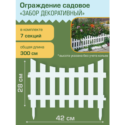 Изделия из пластика уже давно вошли в наш обиход, хорошо себя зарекомендовали, а где-то стали незаменимы. Забор декоративный представлен в привычном для нас виде. Не обошлось без пластика и в наших садах, огородах и участках. За счёт высокой гибкости может создавать любые плавные контуры. Комплектация: Забор декоративный В комплекте 7 секций (28х42 см), общая длина 3 метра Вес комплекта примерно 1080 г Цвета: белый Материал: полипропилен (не содержит вредных веществ) Срок годности не ограничен. Применяется для разграничений газонов, грядок, клумб или дорожек на садовых участках, придомовых территориях. Предназначен для воплощения ландшафтных идей вашего дачного участка или оформления палисадника, ограждений грядок, клумб. Не требует особых условий хранения. Устойчив к ультрафиолету. Прост в использовании, надёжно фиксируется в грунте.