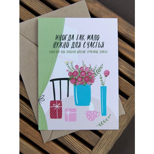 Открытка Чашечка чая и букетик цветов - это прекрасный подарок для любого случая. Она станет прекрасным дополнением к подарку или самостоятельным подарком. Открытка универсальна и подходит для любого повода: дня рождения, юбилея, свадьбы, годовщины или просто для того, чтобы выразить свои чувства. Открытка напечатана на плотной мелованной бумаге 300г/м2 с двусторонней матовой ламинацией, в наборе крафтовый конверт. На лицевой открытки - стильная иллюстрация, а на оборотной - место для подписи и приятных слов для получателя.