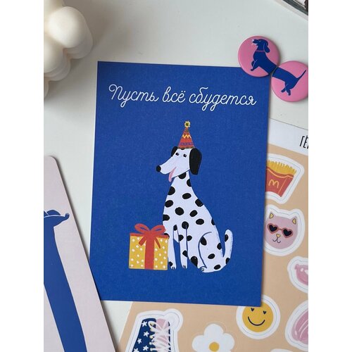 Открытка с собачкой Пусть мечты сбываются от TUTVIKA STUDIO - это не просто открытка, это произведение искусства, которое станет отличным подарком для любого человека. Размер открытки составляет 10,5 см х 14,8 см, что позволяет разместить на ней все самые теплые слова и пожелания. Открытка выполнена на плотной бумаге формата А6, что делает ее удобной для отправки по почте или вручения лично. Авторская открытка с собачкой Пусть мечты сбываются подойдет для любого праздника, будь то день рождения, юбилей или просто приятный сюрприз. Выбирая открытку с собачкой Пусть мечты сбываются, вы делаете отличный выбор в пользу качества, оригинальности и душевности подарка. /м2, что гарантирует яркость и четкость изображения. Напечатана открытка на мелованном картоне плотностью 300 гр. В комплекте с открыткой идет крафтовый конверт, что делает подарок еще более презентабельным и удобным для отправки. Она порадует друзей и близких, станет отличным дополнением к букету или конфетам и может быть использована для коллекционирования. На обратной стороне открытки есть разлиновка для пожеланий, что позволяет сделать подарок еще более индивидуальным и душевным.