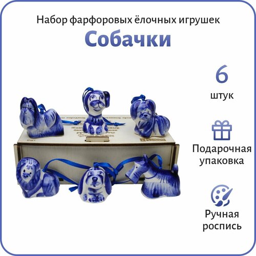 характеристики "Собачки" 6 штук Набор фарфоровых елочных игрушек украшений Гжель коллекция кобальт в фанерной коробке