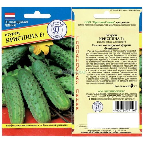 Огурец Криспина F1 Ранний высокоурожайный партенокарпический гибрид корнишонного типа для тех, кому важно качество. Плоды тёмно-зеленого цвета, однородные, крупнобугорчатые, с нежной кожицей, не желтеющие, генетически без горечи. Растение мощное, открытое, формирует по нескольку зеленцов в одном узле. Предназначен для горизонтального выращивания и на шпалере в открытом грунте, а также во втором обороте в плёночных и стеклянных теплицах. Гибрид устойчив к воздушной засухе, к вирусу огуречной мозаики, мучнистой росе, толерантен к пероноспорозу. Прекрасно подходит для выращивания на пикули. Прекрасная транспортабельность сочетается с абсолютными засолочными качествами. Рекомендуется для свежего потребления, транспортировки на большие расстояния, засолки и маринования.