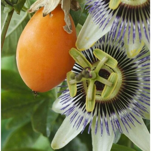 Гостья из южноамериканских стран, предпочитает произрастать в теплых и умеренных широтах с мягкими зимами, но готова расти и в горшках в качестве ампельного растения. Цепляясь тонкими усиками за отвесные стены, она способна подняться на десятиметровую высоту, создавая плотный полог густых зарослей. Расположите цветок страсти на утепленном балконе и в сжатые сроки пассифлора превратит выделенное место в настоящие тропики. Быстрорастущая лиана хорошо растет в открытом грунте и на балконе, если соблюдать правила содержания. Почва предпочтительна легкая, с добавлением песка или торфа, комплексные минеральные удобрения вносят 2 раза в месяц. Цветы одиночные, диаметром до 10 см, состоит из 5 чашелистиков, 5 лепестков, 5 пестиков, 3 тычинок и особого образования – «короны» из множества окрашенных нитей. Тропический экзот несет не только декоративную функцию - его плоды используют в пищу, в медицинских целях и в косметологии. Растение выбрасывает очень ароматные необычные цветы. Длинные усики нуждаются в поддержке для лазания. Плоды чаще округлые, но встречаются и продолговатые, яйцевидные, созревают через 70 дней после опыления, лимонно-желтого окраса. Цветки белые, за исключением пурпурного основания короны; нити курчавые, равны длине лепестков; 5-7 см в поперечнике. Вечнозеленая, вьющаяся лиана с шахматным расположением листьев. Листья трехлопастные, сверху блестящие и темно-зеленые, снизу более светлые и тусклые. Главное условие – освещение, на затененных участках растение может сбрасывать бутоны. Оптимальная температура летом 20.25 градусов, зимой не ниже 7. Летом поливают ежедневно, с опрыскиванием, зимой – раз в неделю, часто проветривают помещение, не допуская застоя воздуха. Цветение происходит с апреля по ноябрь, но иногда может продолжаться круглый год при подходящих условиях. Цветки самоопыляются, за ними следуют зеленые плоды длиной 6 см, которые при созревании становятся пурпурными. Время созревания составляет 80 дней. Плод маракуйя наполнен чудесно терпкой ярко-оранжевой мякотью. Съедобные фиолетовые плоды обладают приятным, сладковатым и немного терпким вкусом. Выращивать лиану необходимо в самом солнечном окне или теплице и с поддержкой в виде решетки. Обрезка необходима для сохранения здоровья лозы. Обрезайте менее сильные ростки и иногда сокращайте их количество, чтобы способствовать цветению. При укоренении и без обрезки маракуйя может легко обогнать другие садовые растения, затеняя их от солнца.