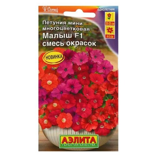 4657936 Семена Петуния мини Малыш F1 многоцветковая, смесь окрасок, 7 шт Удивительно рано и обильно цветущий гибрид петунии чешской селекции. Высаженные на постоянное место растения быстро обра зуют ветвистые компактные кустики. Листвы почти не видно. Периодические подкормки комплексным удобрением делают цветение более обильным. Петунии лучше всего растут в рыхлой, питательной и влагоемкой почве. Множество ярких цветов-граммофончиков диаметром 4-5 см в течение всего сезона будут украшать ваши цветники и рабатки, балконные ящики и вазоны. 25-30 см. Гибрид устойчив к наиболее распространенным болезням культуры. Центр куста не оголяется и растение не нуждается в формировании и прищипке.