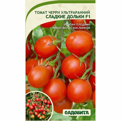Семена томата Сладкие дольки от Садовита - это ультраранний высокоурожайный сорт, который отличается ароматными и сладкими плодами. Период от полных всходов до массового созревания составляет всего 85-90 дней, что делает этот сорт отличным выбором для тех, кто ценит свое время и хочет получить ранний урожай. Они пригодны для употребления в свежем виде, украшения блюд и консервирования. Плоды черри типа, округлые, красные, плотные и очень сладкие. Для получения крепкой рассады и богатого урожая рекомендуется использовать колышки для подвязки. Особенностью сорта Сладкие дольки является рассеченная кисть с обильным формированием плодов. Желаем вам крепкой рассады и богатого урожая. Семена томата Сладкие дольки от Садовита подходят для выращивания как в открытом, так и в закрытом грунте. Масса плода составляет 12-20 г, что делает их отличным выбором для домашней кулинарии и приготовления салатов. Масса кисти может достигать 250-300 г, а количество плодов - 100 штук. Выбирая семена томата Сладкие дольки от Садовита, вы получаете качественный посадочный материал с отличными характеристиками и высокой урожайностью. Растение индетерминантное, высотой до 2 метров, что позволяет получать обильный урожай даже в условиях ограниченного пространства.