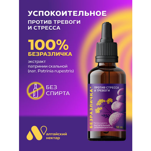Безразличка от бренда Алтайский нектар — натуральное успокоительное для нервной системы. Patrinia rupestris) по своим свойствам является природным антидепрессантом. Высококонцентрированный экстракт патринии скальной (лат. Нормализует сон за счёт благотворного воздействия на нервную систему, уменьшает нервозность, раздражительность, агрессию и другие проявления стресса, повышает концентрацию и работоспособность, улучшает настроение. 1 упаковка курс приёма. По силе седативного эффекта и регулирующему воздействию на сердечно-сосудистую систему при невротических состояниях патриния скальная более чем в 10 раз превосходит валериану лекарственную. Оказывает выраженное успокаивающее действие, повышает сопротивляемость организма стрессам. Успокоительное можно принимать при стрессах и психоэмоциональных нагрузках, при тревожности и раздражительности, при страхах и панических атаках, при нарушениях сна, при снижении мозговой активности после перенесённого стресса, при нарушениях пищевого поведения, вызванных психоэмоциональным стрессом. Концентрат не содержит спирта, не вызывает чувства апатии, сонливости и привыкания. Безразличка (патриния скальная) способствует эффективному расслаблению, восстановлению внутренних органов и систем, работа которых нарушается под воздействием стрессовых факторов (кровеносная система, печень, эндокринные железы).