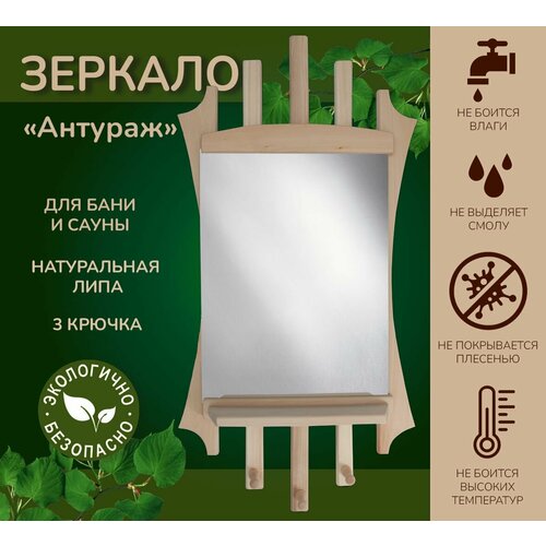Зеркало является незаменимой частью интерьера, к которому надо подходить очень внимательно. Зеркало Антураж сочетает все нужные качества, которые там необходимы Вам. Оно должно быть стильным, надежным и функциональным. Полезным и отличным дополнением к зеркалу идет полка, размер ее 25 см*6 см, и крючки. Такое зеркало сделает ваше пребывание в бане, сауне, ванной комнате более комфортным, атмосферным. Рама для зеркала, полка и крючки изготовлены из липы. Размеры зеркала 30 см* 40 см. Благодаря крючкам на зеркале можно поместить полотенце, халат, головные уборы и тому подобное. На полку можно поместить любые необходимые для вас вещи. Дерево липы влагоустойчивое, не выделяет смолу при высоких температурах, не рассыхается, исходит приятный медовый аромат. Так же оно является отличным элементом декора.