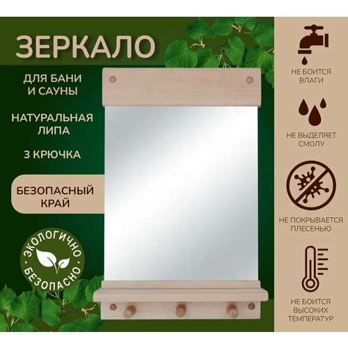 характеристики Зеркало настенное с полкой и крючками для бани и сауны "Оригинальное", липа , 45 см* 28 см*6,5 см