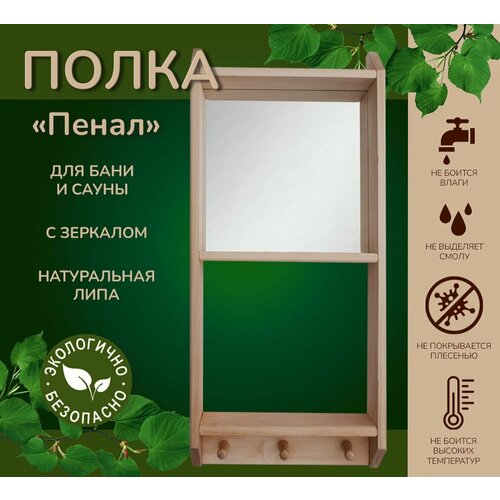 КУПИТЬ Зеркало в баню и сауну из дерева настенное с полкой и крючками "Пенал", липа за 1606 руб