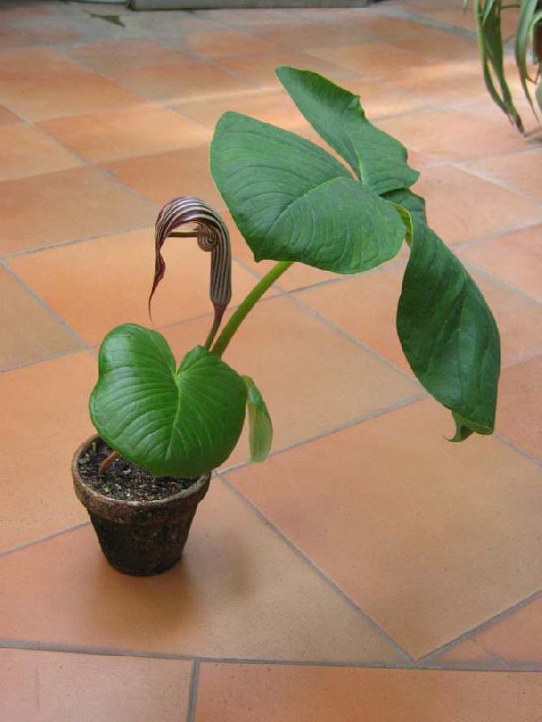 braun Pot Blumen Dragon Arum, Kobra-Pflanze, Amerikanische Wake Robin, Jack In Der Kanzel foto