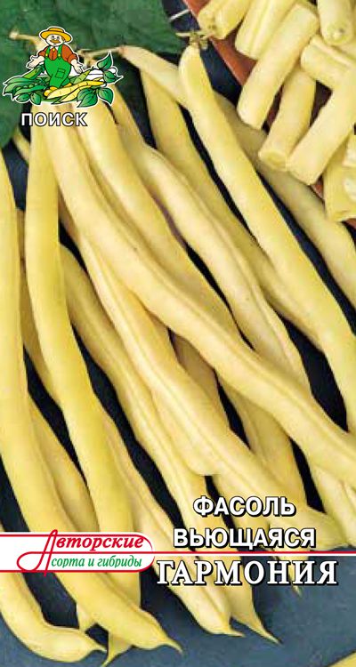 Сорт фасоли Гармония представляет собой вьющуюся разновидность спаржевой фасоли с длиной плетей, достигающей 3-4 метров. Характеризуется средними сроками созревания (65-85 дней от всходов до технической спелости), что делает его подходящим для выращивания в регионах с умеренным климатом. Отличительной особенностью являются золотистые стручки внушительной длины (до 25 см), содержащие нежные бобы молочного оттенка. Отсутствие пергаментного слоя обеспечивает высокое качество вкуса и делает стручки пригодными для употребления в пищу в молочной спелости. Растение демонстрирует высокую урожайность и неприхотливо в уходе, хотя и требует опоры для своего роста.