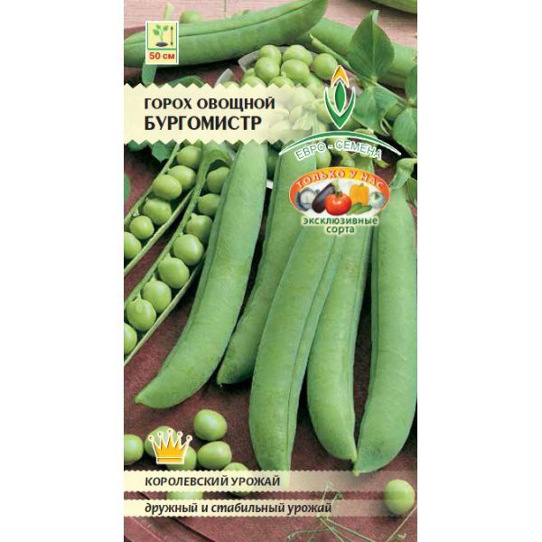 Сорт гороха Бургомистр относится к раннеспелым лущильным сортам. От появления всходов до созревания первых бобов проходит 55-62 дня. Растение низкорослое, высотой 50-55 см, не требует опоры. Бобы слабоизогнутые, широкие, длиной 8-10 см. В каждом стручке содержится 6-10 крупных, сладких горошин. Створки бобов несъедобные. Горох Бургомистр ценится за высокую урожайность, устойчивость к заболеваниям и неприхотливость к условиям выращивания. Он подходит для выращивания в любых регионах России, в открытом грунте и в теплицах.Особенности сорта