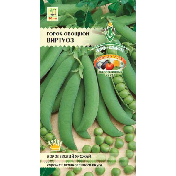 Сорт гороха Виртуоз . среднеспелый, лущильный. От всходов до сбора урожая проходит 74-82 дня. Растение высотой 80-90 см, требует опоры. Бобы слабоизогнутые, длиной 10-11 см, узкие, с 8-9 горошинами. Горошек темно-зеленый, выровненный по окраске и размеру, великолепного вкуса. Сорт отличается равномерным созреванием и отличными вкусовыми качествами. Рекомендуется для выращивания в Центральном и Центрально-Черноземном регионах.Общая характеристика