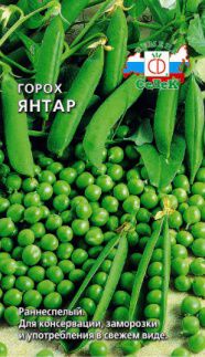 Сорт гороха Янтарь характеризуется раннеспелостью, периодом вегетации от 49 до 57 дней от всходов до технической спелости. Относится к лущильным сортам. Растение среднерослое, достигает высоты 60-70 см. Бобы слабоизогнутые, узкие, с заостренной верхушкой, темно-зеленого цвета, длиной 6-8 см, содержат 4-6 темно-зеленых горошин. Отличается дружным созреванием плодов. Створки бобов в пищу не употребляются. Сухое зерно богато белком (22-34%), крахмалом (20-48%), а также содержит жиры, клетчатку и золу.