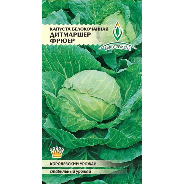 Сорт белокочанной капусты Дитмаршер Фрюер, выведенный немецкими селекционерами и внесенный в Госреестр РФ в 1995 году, характеризуется ранними сроками созревания (75-112 дней в зависимости от климатических условий). Относится к раннеспелым гибридам, отличающимся стабильной урожайностью (до 4 кг/м.). Розетка листьев низкая, полуприподнятая, листья средние или мелкие, светло-желто-зеленого цвета, широкояйцевидной формы с волнистым краем. Кочаны округлые или плоскоокруглые, плотные, массой от 0,8 до 2,4 кг, внутренняя кочерыга короткая. Сорт демонстрирует устойчивость к слизистому бактериозу и среднюю восприимчивость к сосудистому. Дитмаршер Фрюер подходит для выращивания в открытом грунте в различных регионах России. Отмечается хорошая транспортабельность. Предпочтительно использование в свежем виде.