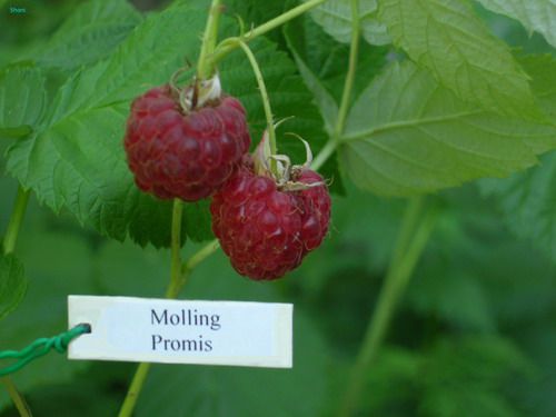 Плоды малины Моллинг Промис характеризуются крупным размером и однородностью. Средняя масса ягод составляет от 2,5 до 7 граммов, хотя встречаются экземпляры и более крупного размера, до 7,6 г, по данным некоторых источников. Форма ягод – выраженный конус, правильный и симметричный. Отмечается наличие многочисленных крупных костянок. Окраска зрелых ягод – интенсивный, насыщенный ярко-красный цвет. Характерной особенностью является сохранение зеленого кончика на ягоде даже при полной зрелости, что необходимо учитывать при сборе урожая, ориентируясь на общую окраску плода, а не только на его верхушку. Данная особенность не влияет на вкусовые качества и содержание полезных веществ.
