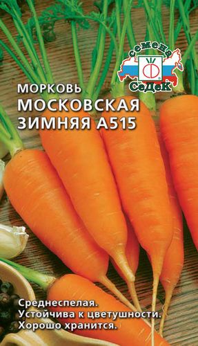 Сорт моркови Московская Зимняя А 515 относится к среднеспелым, высокоурожайным, отличается отличной лежкостью. Период вегетации составляет 90-110 дней от всходов до уборки. Корнеплоды конической формы с тупым кончиком, ярко-оранжевого цвета, достигают длины 15-16 см и массы до 180-200 г. Мякоть оранжевая, плотная, сочная, хрустящая, сладкая, без горечи и волокнистости. Характеризуется высоким содержанием каротина (около 9 мг в 100 г), что способствует накоплению витамина А. Сорт демонстрирует устойчивость к цветушности. Предназначен для длительного хранения и употребления в свежем виде. Подходит для различных кулинарных целей. салаты, супы, соки. Семена пригодны для подзимнего посева.