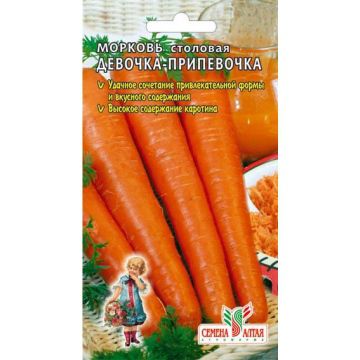 Сорт моркови Девочка-Припевочка характеризуется средним сроком созревания (100-115 дней) и относится к сортотипу Нантская. Отличается крупной розеткой листьев. Корнеплоды обладают цилиндрической формой с тупоконечным окончанием, гладкой поверхностью и достигают длины 20-22 см. Средняя масса корнеплода составляет 90-140 г. Окраска корнеплодов, оранжево-красная, что обусловлено высоким содержанием каротина. Сорт ценится за сочные и сладкие корнеплоды, что делает его привлекательным для любителей этого овоща;