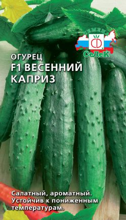 Гибрид Весенний Каприз F1 представляет собой раннеспелый (42-45 дней от всходов до сбора урожая) партенокарпический сорт огурца, предназначенный для культивирования в открытом грунте и под пленочными укрытиями. Растение характеризуется индетерминантным типом роста, с длинными плетями. Плоды обладают удлиненно-цилиндрической формой, бугорчатой поверхностью и насыщенно-зеленой окраской. Длина зеленцов составляет 20 см, диаметр – 3,5-4,0 см. Кожица тонкая и нежная, семенная камера небольшого размера. Отмечаются высокие вкусовые качества. сладкий вкус без горечи. Сорт демонстрирует неприхотливость в выращивании, устойчивость к пониженным температурам и продолжительный период плодоношения. Средняя урожайность составляет 12-16 кг/м.. Предназначен для использования в свежем виде, в салатах.