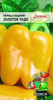 Сорт сладкого перца "Золотое чудо", выведенный селекционерами агрофирмы "Поиск" и принятый Госреестром в 2007 году, характеризуется средним сроком созревания и высокой приспособляемостью к климатическим условиям России и стран СНГ. Отличается крупными, толстостенными плодами кубовидной или призмовидной формы, достигающими 9-10 см в высоту и диаметре. Толщина стенок плодов составляет 5-7 мм. В стадии технической зрелости окраска светло-зеленая, переходящая в золотисто-желтую при биологической спелости. Масса плодов варьируется от 180 г при формировании куста до 240-250 г при интенсивной агротехнике в условиях теплиц. Плоды обладают превосходными вкусовыми качествами, деликатно-выраженным ароматом и универсальны в применении. подходят для салатов, консервирования, заморозки и фарширования. Отлично переносят транспортировку и длительное хранение после полного созревания. Растение среднераскидистое, высотой около 60 см в открытом грунте и до 70 см в теплице, нуждается в опоре из-за веса плодов.