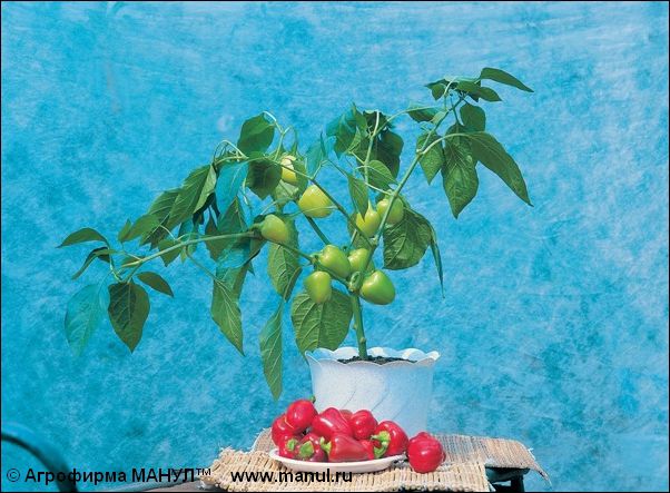 Раннеспелый сорт, пригодный для выращивания на подоконнике. Кустик перца низкорослый, около полметра. Цветение наступает на 60 день после посева семян. Сбор урожая можно планировать через 95-105 дней после всходов. Плоды сочные, весом до 70 г, в форме конуса, при вызревании меняют цвет с светло-зеленого на красно-оранжевый. Поверхность плодов глянцевая, гладкая. Вкус сладкий, пикантный. Сорт устойчив к табачной мозаике.Характеристика сорта