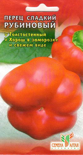 Плоды перца Рубинового крупные‚ массой 110-170 г‚ ширококонусовидной формы‚ с гладкой поверхностью. В технической спелости плоды имеют темно-зеленую окраску‚ которая по мере созревания меняется на темно-красную. Толщина стенки плода составляет 8-10 мм. Мякоть сочная‚ нежная‚ сладкая‚ с высоким содержанием витамина C и других полезных веществ.