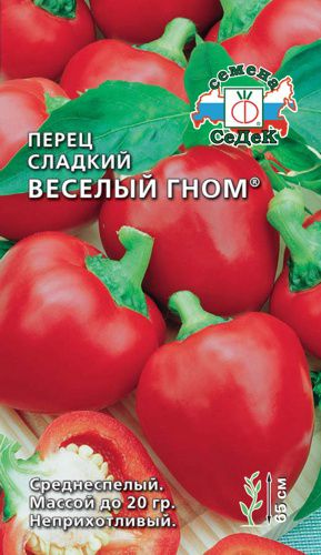 Сорт перца «Веселый Гном» характеризуется ранним сроком созревания (100-105 дней), компактным, кустистым габитусом, что делает его пригодным как для открытого грунта, так и для выращивания в контейнерах. Растение полураскидистое, высотой до 65 см. Плоды миниатюрные, остроконечные, отличаются уникальным терпким, слегка острым вкусом. Отмечается высокая урожайность и одновременное формирование на одном растении до 20 плодов. Цвет плодов в технической спелости темно-зеленый, в биологической – темно-красный. Масса одного плода составляет 10-20 г. Сорт идеально подходит для употребления в свежем виде и консервирования.