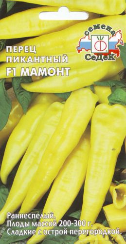 Перец Мамонт F1 — это раннеспелый гибрид для открытого грунта и пленочных укрытий. Растение среднерослое, высотой 50-60 см. Плоды пониклые, узкоконусовидные, в технической спелости зеленые, в биологической ярко-желтые, длиной 20-25 см, массой 200-300 г, пикантного вкуса. сладкие с острой перегородкой. Толщина стенки 3 мм. Урожайность 7,5 кг/м.. Ценность гибрида. устойчивость к вирусу табачной мозаики, обильное плодоношение, отличное качество плодов. Рекомендуется для употребления в свежем виде и для кулинарной переработки.Общая характеристика сорта