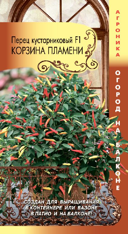 Гибрид перца Capsicum frutescens F1 «Корзина Пламени» (Basket of Fire F1) представляет собой холодостойкий, урожайный кустарниковый сорт острого перца с полуампельной формой роста. Идеален для выращивания в подвесных корзинах, кашпо и контейнерах. Растение формирует ветвящийся куст высотой 30-35 см и диаметром до 60 см, создавая впечатляющий декоративный эффект, напоминающий пылающий фейерверк благодаря обильному количеству плодов. Период вегетации составляет 87-95 дней от всходов до созревания. Плоды конической формы, меняют окраску от темно-фиолетовой до кремовой, оранжевой и, наконец, ярко-красной по мере созревания. Отличается неприхотливостью и подходит для выращивания как в открытом грунте, так и в домашних условиях.