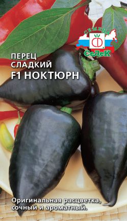Ноктюрн F1 — среднеранний гибрид перца, предназначенный для выращивания в теплицах и под пленочными укрытиями. Растение мощное, достигает высоты 70-80 см, требует подвязки и пасынкования. Плоды конусовидные, с заостренной верхушкой, массой 50-90 г, толщина стенки 4-6 мм. В технической спелости имеют темно-фиолетовую окраску, при полном созревании — темно-вишневую. Перец Ноктюрн F1 отличается сладким вкусом и подходит как для употребления в свежем виде, так и для консервирования. Устойчив к болезням и вредителям, отличается высокой урожайностью.Вкусовые качества и внешние характеристики