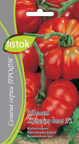 Томат Женская доля F1 – раннеспелый гибрид, предназначенный для культивирования как в открытом, так и в защищенном грунте. Отличается оригинальной формой плодов. крупные, ярко-красные томаты обладают плоской формой с выраженной ребристостью. Средняя масса плода составляет 180-200 г, мякоть характеризуеться высокой плотностью и отличными вкусовыми качествами. Гибрид демонстрирует высокую урожайность. в теплице с одного куста можно получить до 5 кг, в открытом грунте – до 3 кг. Благодаря своим характеристикам, сорт Женская доля F1 представляет интерес для как для любительского, так и для коммерческого выращивания.