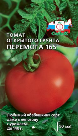 Томат Перемога 165 – сорт, характеризующийся среднеранними (97-115 дней) сроками созревания. Выведен белорусскими селекционерами и допущен к выращиванию в нескольких регионах России, включая Центральный, Волго-Вятский и другие. Встречается информация о разной высоте куста. от 40-50 см (детерминантный) до 180 см (полудетерминантный), что может указывать на вариативность фенотипа или наличие различных клонов. Плоды описываются как плоскоокруглые или сердцевидные, красные или пурпурно-фиолетовые, массой от 80 до 350 г. Отмечается высокая вкусовая привлекательность, мясистость и сладкий вкус. Сорт демонстрирует устойчивость к распространенным заболеваниям томатов и стрессовым факторам, хорошо реагирует на удобрения и полив. Рекомендуемая плотность посадки составляет 3 растения на квадратный метр. Томат Перемога 165 подходит как для свежего потребления, так и для переработки.