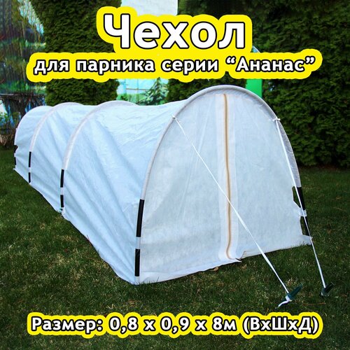 Чехол для парника серии «Ананас» размером: 0,8?0,9?8 м (ВхШхД). Чехол является не просто «накидкой» на каркас, а сложным швейным изделием с дверьми, с секциями, с рукавами-каналами для дуг, с лямками и т. Также подходит для дуг парников аналогичных размеров, с длиной дуги не выше 2 м. Материал Райфенхаузер производится по специальной рецептуре по техническому заданию производителя «Даяс». 2) Снизу, возле земли, предусмотрен запас материала, который загибается на грунт. Поэтому делает использование парника удобным и долговечным. 3) На торцах чехла сделаны двери с износостойкими замками на молнии. В уличных условиях при порывах ветра молнии не будут самопроизвольно расстегиваться, а также не будут расходиться со временем. Молнии снабжены надежными стальными никелированными бегунками с функцией «Автостоп». Особенности чехла «Ананас»: 1) Чехол сшит из укрывного материала марки Райфенхаузер SSS-60. 4) Дуги продеваются внутрь специальных каналов-рукавов, которые вшиты между секциями. д. Доступ внутрь парника прост и удобен — достаточно расстегнуть застежки-молнии и распахнуть половинки дверей. Благодаря современным технологиям и особой рецептуре данный материал существенно отличается от обычных укрывных материалов серии «Агро». Отличий и нюансов много, но самое важное для садоводов — это более долгий срок службы и то, что под этим материалом автоматически формируется наиболее благоприятный микроклимат для развития растений. Это удобно для придавливания его грузом, чтобы чехол не задирался при порывах ветра. Такая конструкция очень ветроустойчива. Также благодаря этому нижние участки чехла можно сдвигать вдоль дуг вверх и получать доступ внутрь парника не только со стороны дверей, но и с его боков. 5) Рукава, куда вставлены дуги, сделаны из другого, более толстого материала, поэтому при сильных ветрах секции не изнашиваются — всю ветровую нагрузку берут на себя эти усиленные рукава. Срок службы вашего парника увеличивается. 6) Чтобы материал быстро сдвигался и не перетирался о дуги, ниже рукавов пришиты капроновые лямки, которые легко решают эту задачу. После полива или обработки растений чехол с боков спокойно опускается вдоль дуг вниз.