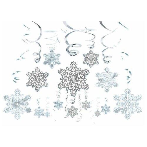 Украшение для вашего праздника - оригинальная бумажная гирлянда-спирали Снежинки. Спирали под потолок многоразового использования выполнены из плотной бумаги и имеют специальные пластиковые крючки, которые можно прикрепить на люстру или просто к потолку (с помощью двустороннего скотча). Декорация в виде фольгированных спиралей с подвешенными белыми и серебряными снежинками - новогоднее украшение интерьера. Повесьте гирлянду под потолок для создания праздничной обстановки. Ни одна фотозона и фотосессия не может обойтись без такой гирлянды. Интерьерный декор из картона прекрасно подойдет для декорации на Новй год, день рождения девочки, 14 февраля (День святого Валентина) или свадьбу. В комплекте 30 спиралей размером 46-60 см. Используйте наши спиральки декоративные с другими элементами коллекции (тарелки, стаканы, салфетки, свечи для торта, воздушные шары) и удивите ваших гостей. Остается подключить фантазию и творчество, добавить воздушные шары для стильной фотозоны, и фотографии с такой гирляндой получатся незабываемые.