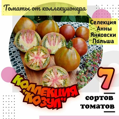 Анна Янковски - современный селекционер из Польши. Всем своим новинкам селекционер даёт не названия, а порядковый номер. Она скрещивает самые интересные сорта томатов, чтобы получить новые, необычной расцветки и устойчивые к болезням сорта. Козула 25 - Индетерминантный (1,5 - 1,7 метра), среднеранний сорт. Мякоть - сочная, мясистая, маслянистая, тоже очень красивого окраса - зелёная с розовыми оттенками по центру. Предлагаем вам познакомиться с сортами томатов Анны Янковски - это коллекционные томаты, которые нельзя найти в продаже у агрофирм. Козула 29 - Индет. Средний вес 250 - 500 грамм. Плоды - плоскоокруглые бифштексы, красно- коричневые с тёмно- зелёными камуфляжными полосами, перламутровые, как будто покрыты воском. В набор входит 7 сортов томатов, каждый упакован в зип пакетик (10 семян) с описанием сорта и картинкой. Мякоть - тёмно- малинового цвета, сахарная на изломе, арбузного типа, практически без семян и сока. В коллекции томатов Козул насчитывается уже около двух сотен разных сортов. (1,8 - 2,0 метра в теплице), среднеспелый сорт. Плоды - плоскоокруглые, часто с ребристыми плечиками, полосатого окраса - на зелёном фоне камуфляж из розово- малиновых полос. Средний вес 250-350 грамм. Вкус - богатый, сладкий, с фруктовыми нотками. Вкус - очень насыщенный, томный, сладкий с гармоничной кислинкой. Отличный салатный сорт, которым можно баловать себя летом. Соки из него получаются вкусными, насыщенного цвета. Козула 68 - Индет, раннеспелый сорт. Плоды - сливовидные или в форме трюфеля, с неглубокими рёбрами, коричневого цвета с бронзовым напылением и зелёными плечиками. При перезревании плоды становятся полностью коричневыми. Средний вес 100 - 250 грамм. Мякоть изумительно красивая - зелёно- жёлтая с малиновыми разводами, сочная. Вкус - очень насыщенный, сладкий, с фруктовыми оттенками. Сорт идеален для вкуснейших летних салатов. Козула 72 - Индет, среднеспелый. Плоды - плоскоокруглые, шоколадно- вишнёвого цвета, средней массой 150-300 грамм. Мякоть - мармеладной консистенции, вишнёвого цвета, семена находятся в зеленоватом соке. Вкус - сладкий, с фруктовыми нотками и едва уловимой кислинкой. Сорт молодой, не достаточно стабильный, поэтому может давать расщепление. Сорт подходит для свежего потребления, приготовления соков и переработки. Козула 84 - Индет, среднеспелый сорт. Плоды - сердцевидные, часто в виде сдвоенных сердец, насыщенного жёлто- оранжевого цвета, средней массой 150-250 грамм. Мякоть - такая же жёлто- оранжевая, как и плод снаружи, мясистая, песочно- сахаристого типа, практически без семян и сока - сплошное помидорное мясо. Вкус - мягкий, сладкий, слегка фруктовый, практически без кислоты. Козула 90 - Индет, среднеспелый сорт. Плоды - удлинённые сливки с тупым носиком, красно- коричневого цвета с золотисто- зелёными разводами и штрихами. Средней массой 60 - 120 грамм. Мякоть - красно- коричневого цвета, сочная, мясистая. Кожица не плотная, но не склонна к растрескиванию. Вкус - сбалансированный, с преобладанием сладости. Идеален для цельноплодной консервации. Козула 141 - Индет, среднеспелый сорт. Плоды - грушевидные или овальные, с еле заметными рёбрами у плодоножки, оранжево- жёлтые с розовым румянцем на верхушке плода. Масса 120 - 200 гр. Мякоть - очень плотная, но не грубая, оранжево- жёлтая с розовыми прожилками, мясистая. Вкус гармоничный, с преобладанием сладости. Сорт 