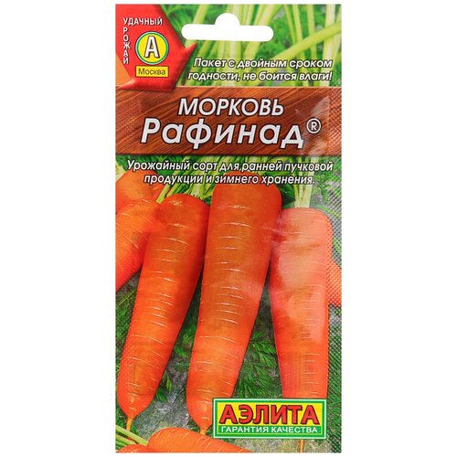Семена по типу: Семена Морковь Рафинад, 2 г Габариты: 8 см х 15 см х 0,2 см Количество упаковок в заказе, шт: 1 Дополнительные характеристики: Раннеспелый урожайный сорт сортотипа Шантенэ. Корнеплод крупный, оранжевого цвета, конической формы, длиной 15-20 см, массой 120-150 г. Период от всходов до технической спелости корнеплодов 85-90 дней. До появления всходов посевы рекомендуем укрыть пленкой для сохранения оптимальной влажно-сти почвы. Возможен подзимний посев (в конце октября – начале ноября) на глубину 3 см. Хороший сорт для продажи на пучок и для длительного зимнего хранения. Мякоть сочная, сладкая, содержание сахаров и каротина выше среднего уровня. Второе прореживание проводят, когда корнеплоды достигнут диаметра 1 см. С развитием первых двух пар настоящих ли-сточков растения прореживают. Урожайность – 5-6 кг/м2 Посев Посев семян в бороздки на глубину 1,5-2,0 см. Агрономический срок годности, лет: 3.