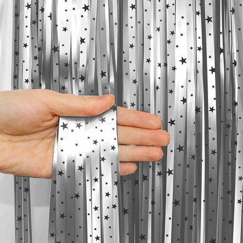 Купить Занавес "Дождик" Серебряный с черными звездами / 2м*1м, 1 шт за 276 руб