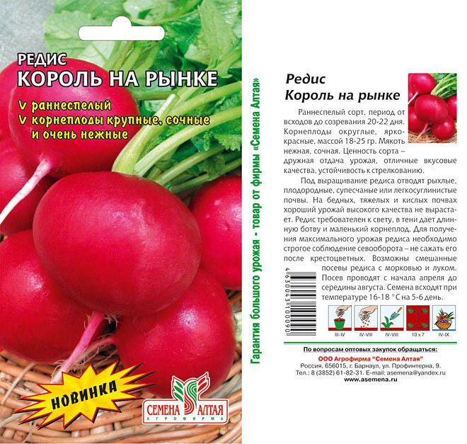 Сорт редиса «Король на рынке» благодаря своим характеристикам занимает уверенную позицию на рынке семян и свежей сельскохозяйственной продукции. Ранние сроки созревания и высокая урожайность делают его привлекательным для коммерческого выращивания, ориентированного на быструю реализацию продукции. Отличные вкусовые качества и привлекательный внешний вид корнеплодов обеспечивают положительный потребительский спрос. Устойчивость к стрелкованию повышает конкурентоспособность сорта, гарантируя стабильный урожай высокого качества. Все это способствует успешному позиционированию сорта как надежного и выгодного варианта для производителей и потребителей.
