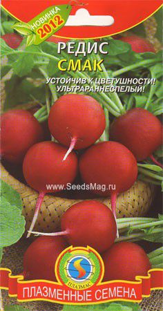 Сорт редиса "Смак" позиционируется как ультраскороспелый, занимающий лидирующие позиции на рынке ранней овощной продукции. Характеризуется дружным формированием выровненных корнеплодов. "Смак" ценится за стабильность урожая и отменные вкусовые качества. Это растение предназначено для выращивания как в открытом, так и в защищенном грунте, что делает его универсальным для различных климатических зон. Редис "Смак" отличается высокой скоростью созревания, что позволяет получить ранний урожай. Сорт адаптирован для разных регионов.