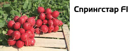 Спрингстар F1 – гибрид редиса‚ характеризующийся раннеспелостью. Вегетационный период составляет 23-25 дней. Отличается выравненностью и ярко-красным окрасом корнеплодов‚ а также короткой ботвой.