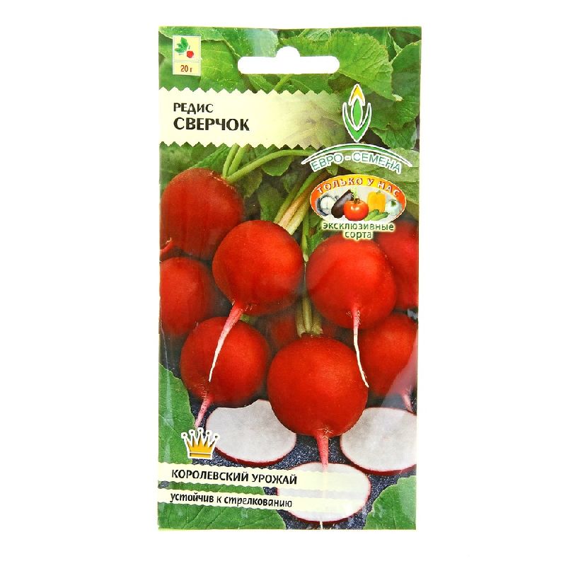 Редис Сверчок – раннеспелый сорт, характеризующийся высокой товарностью. Вегетационный период составляет 25-32 дня. Корнеплоды округлые, темно-красного цвета, обладают хрустящей мякотью и хорошими вкусовыми качествами. Сорт включен в Госреестр РФ для выращивания в личных подсобных хозяйствах.