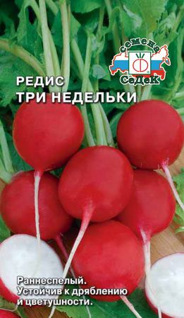 Сорт редиса "Три недельки" характеризуется ультраранним сроком созревания – от 19 до 21 дня с момента появления всходов. Это делает его идеальным вариантом для получения раннего урожая в весенний и позднелетний периоды. Выращивание осуществляется в открытом грунте. Корнеплоды сорта отличаются округлой, выровненной формой и насыщенно-красным цветом. Средняя масса одного корнеплода составляет 10-15 г. Мякоть белая, нежная, сочная и хрустящая, обладает полуострым вкусом. Сорт демонстрирует высокую устойчивость к преждевременному цветению, что гарантирует стабильный урожай качественных корнеплодов. Благодаря выравненности плодов, сорт хорошо подходит для транспортировки и реализации.